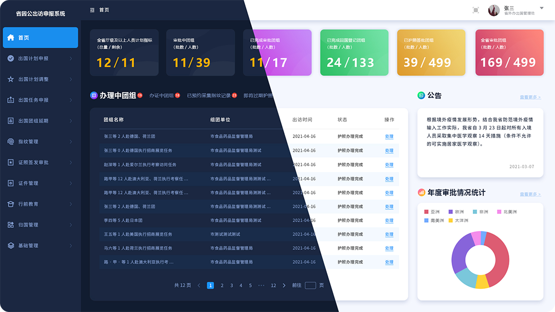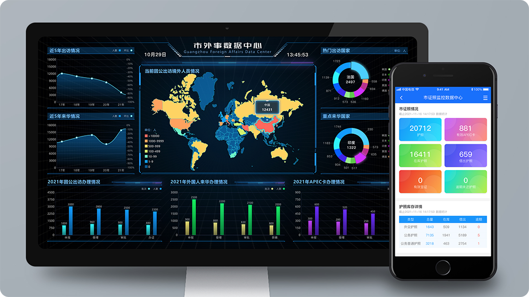 市外事数据中心是整个市外办的数据统计分析平台,在此平台上, 能够实现近5年出访数据、热门出访国家、因公出访办理情况、外来华办理情况、APEC卡办理情况的数据统计查询,可按照年度进行筛选。 并根据各数据维度生成统计分析报表,通过饼图、柱状图、折线图等报表形式进行数据呈现,用图表这种友好的数据统计方式, 呈现外办的出访情况,对于数据统计分析的结果,支持导出、打印等操作。为领导决策层提供数据支撑,以便于领导层能够更好的进行决策。