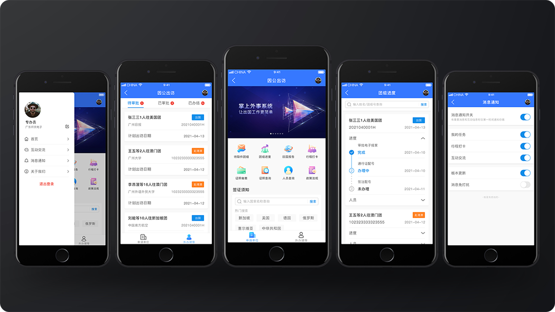 市掌上外事系统,能满足移动端的外事数据查询和使用的需求, 比如随时随地的查询、随时随地的处理外办业务等等, 而掌上终端就能够实现移动端和PC端的数据互联互通。 能够在线申报、审批以及办理因公出访业务, 功能包括团组进度查询、证件查询、人员查询、待办业务、消息提醒、在线审批、签证须知查询、互动交流、自动催审等等。 将传统PC端的业务,无缝衔接至移动端,满足移动端办公的要求,随时随地处理外事业务,加快审批,提高工作效率。
